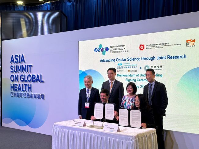 | Connected through Deal-making in last Asia Summit on Global Health, representatives from Centre for Eye and Vision Research Limited, a local university research centre, and Cloudbreak Pharma Incorporated signed a MOU on ocular science research on the first day of the Summit, witnessed by HKTDC Deputy Executive Director Dr Patrick Lau (2nd from left, back row) |