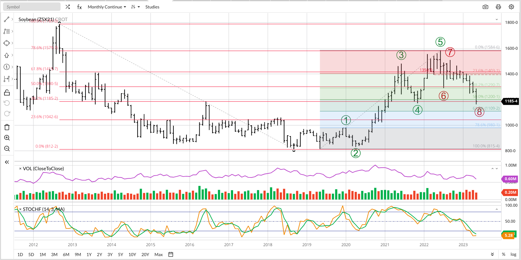 The only one of these three factors to have changed, as of late May 2023, is the weather. Given grain and oilseed markets (as well as softs and energies to a certain extent) are weather derivatives at heart, it makes sense Dec23 corn is in position to complete a bullish reversal pattern on its long-term continuous monthly chart this month. For the record, this chart moved into a long-term downtrend at the end of May 2022. As for futures spreads, the 2023-2024 market has covered a bullish level of calculated full commercial carry going back to at least August 2022 meaning the commercial side of the market believed the tight supply and demand situation was not going to be solved with the next crop.