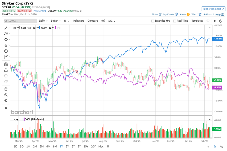 Shares of this Medtech giant have underperformed the broader market over the past year. SYK has declined 6.9% over this time frame, while the broader S&P 500 Index ($SPX) has rallied nearly 14.4%. However, in 2026, SYK’s stock rose 3.5%, surpassing the SPX’s 1.4% rise on a YTD basis.