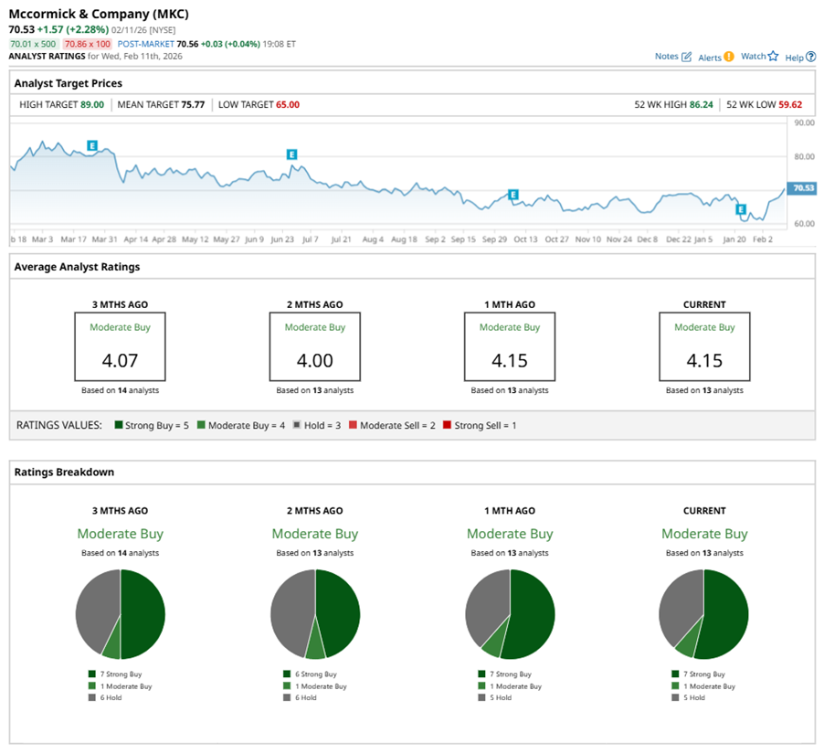 Among the 13 analysts covering MKC stock, the consensus is a “Moderate Buy.” That’s based on seven “Strong Buy” ratings, one “Moderate Buy,” and five “Holds.”