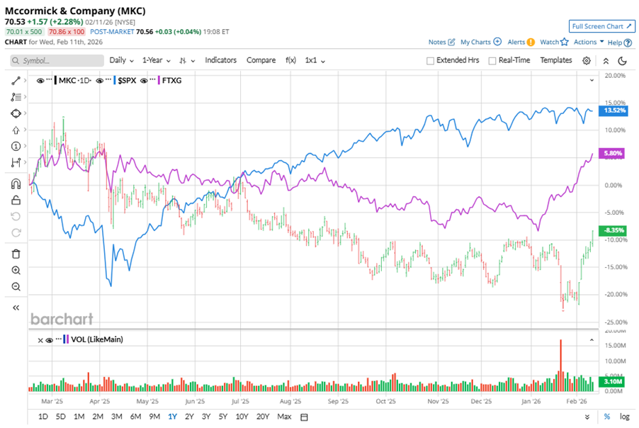 Shares of this global leader in flavor, seasonings and spices have underperformed the broader market over the past year. MKC has declined 8.6% over this time frame, while the broader S&P 500 Index ($SPX) has rallied nearly 14.4%. However, in 2026, MKC stock is up 3.6%,surpassing the SPX’s 1.4% rise on a YTD basis.