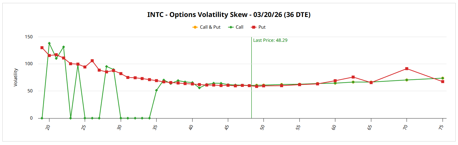 While we now have a general understanding of smart money sentiments, we’re still at a loss as to how this may translate into actual price outcomes. For that, we may turn to the Black-Scholes-derived Expected Move calculator. Wall Street’s standard mechanism for pricing options calculates that Intel stock may land between $42.08 and $54.50 for the March 20 expiration date.