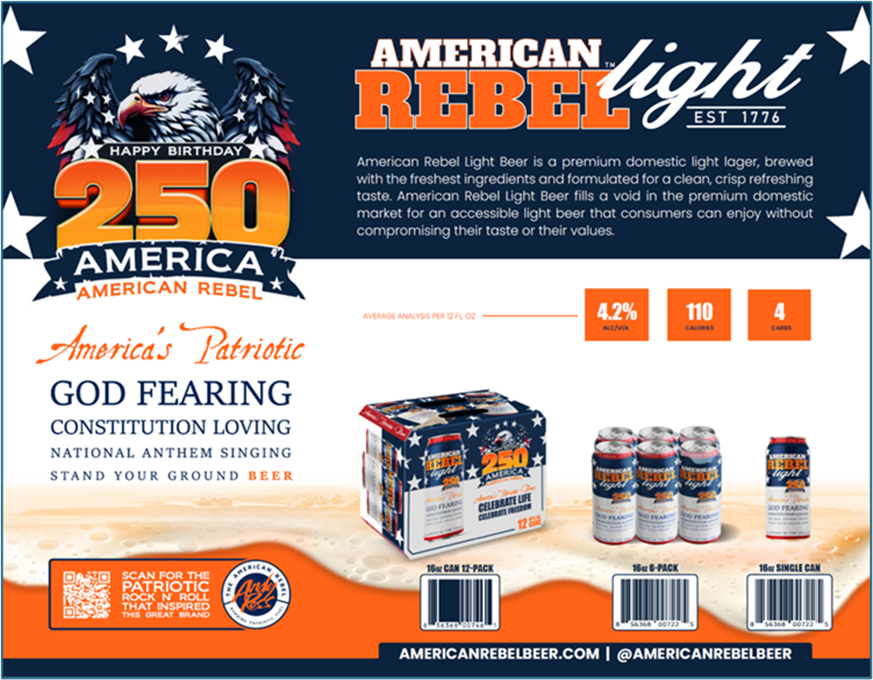 With the introduction and rapid growth of American Rebel Light Beer—America’s Patriotic, God-Fearing, Constitution-Loving, National Anthem-Singing, Stand-Your-Ground Beer—the Company continues to execute its distribution-first growth strategy across the United States and is leveraging its brand position as “America’s Patriotic Brand™” to build a scalable national platform across multiple consumer categories.