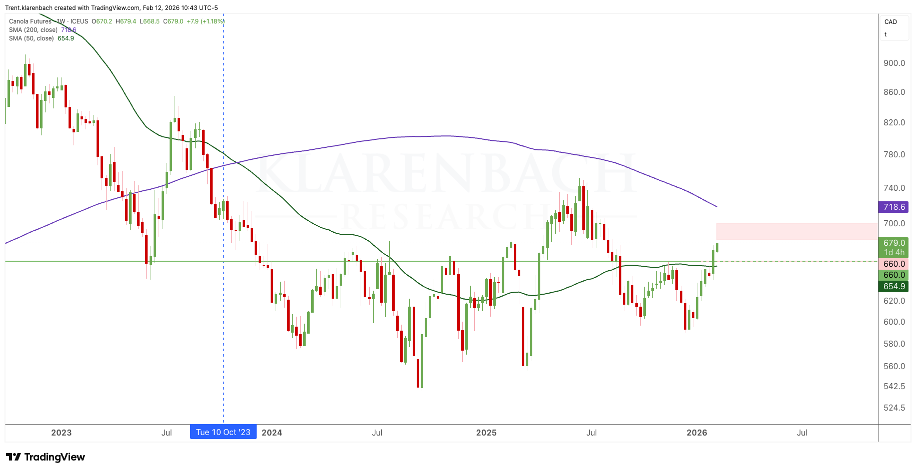 Canola is approaching a significant overhead supply in the 683 to 700 range.