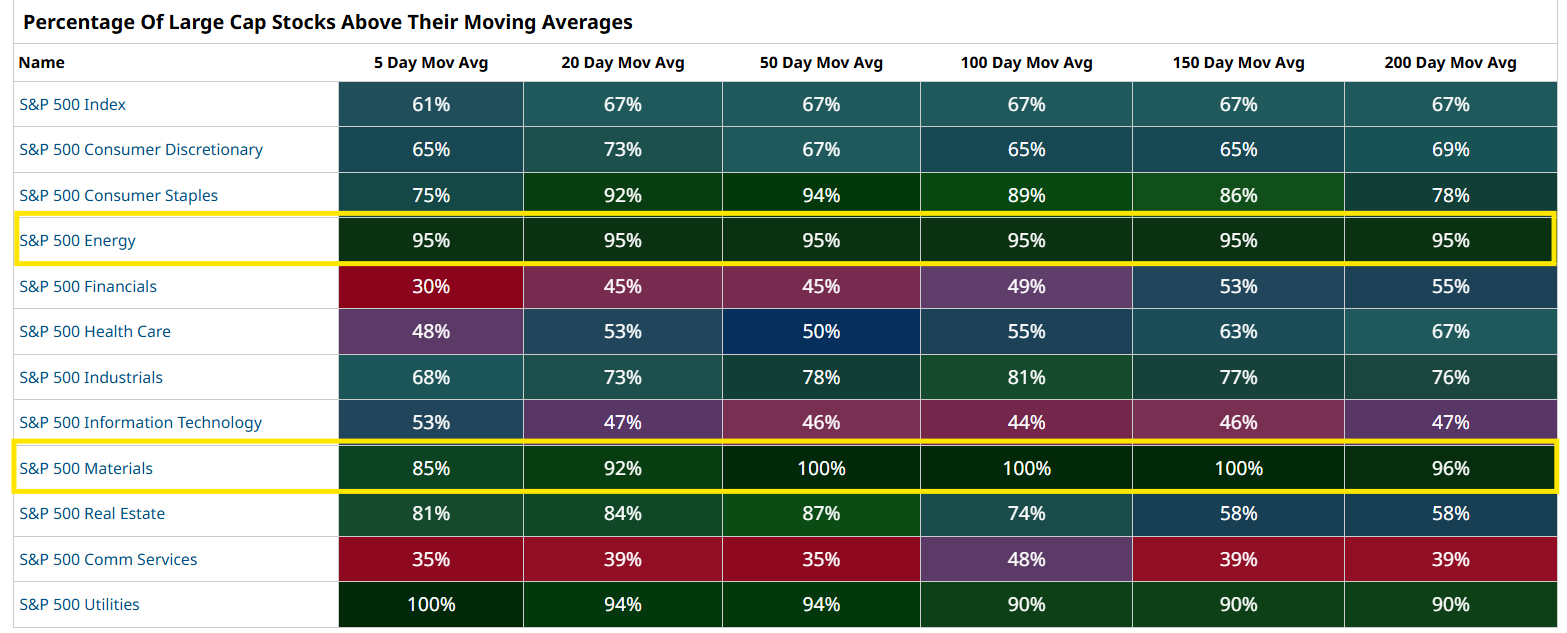 That divergence isn’t random. And John highlights something even more powerful than price performance. Currently, over 90% of Energy and Materials stocks are trading above their 20-, 50-, and 100-day moving averages.