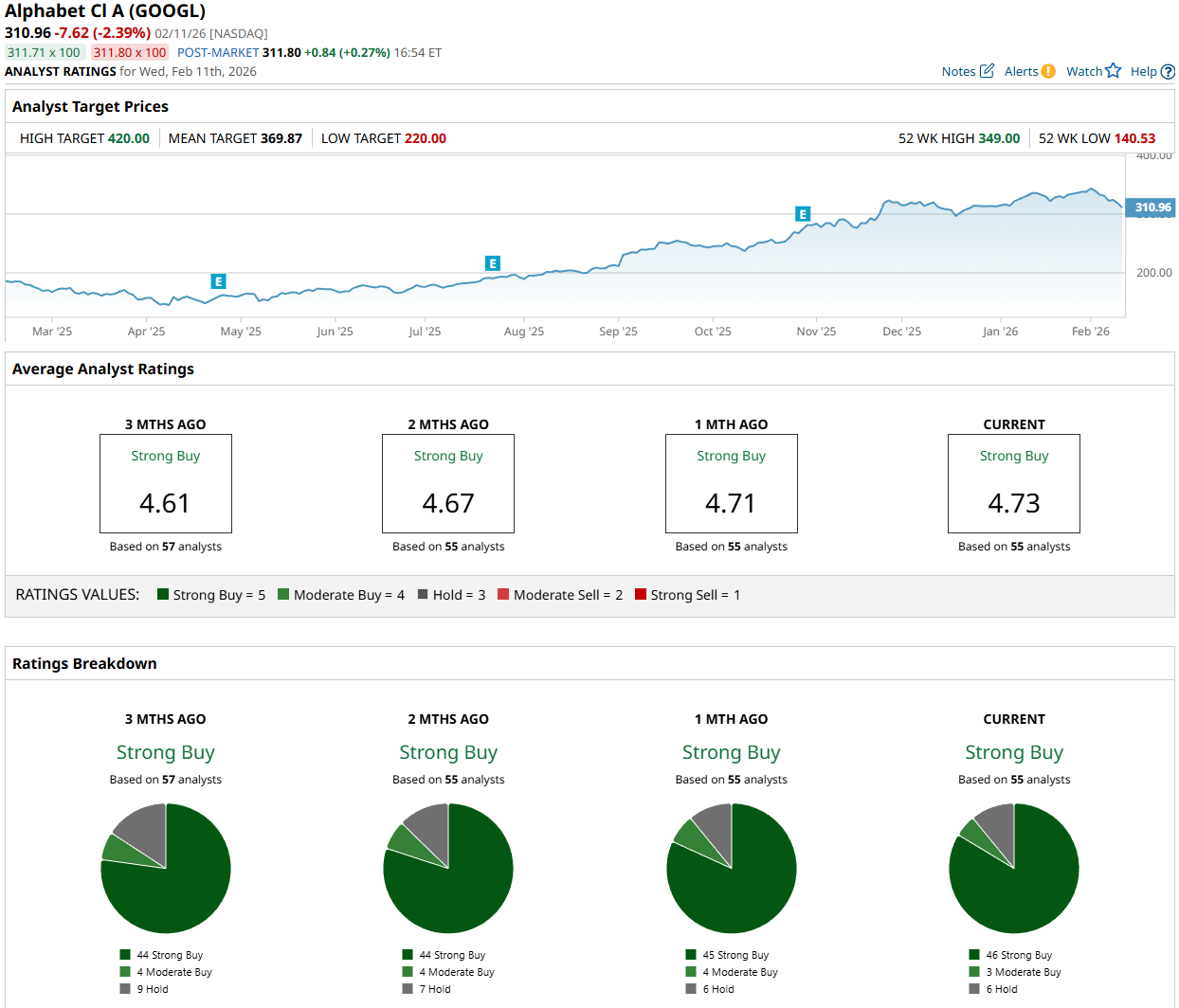 Wall Street analysts are very bullish on Alphabet, assigning the stock a top-tier “Strong Buy” consensus rating. Among the 55 analysts covering the stock, 46 recommend a “Strong Buy,” three suggest a “Moderate Buy,” and the remaining six give a “Hold” rating. The average price target for GOOGL stock is $369.87, implying a 19% upside potential from current levels.