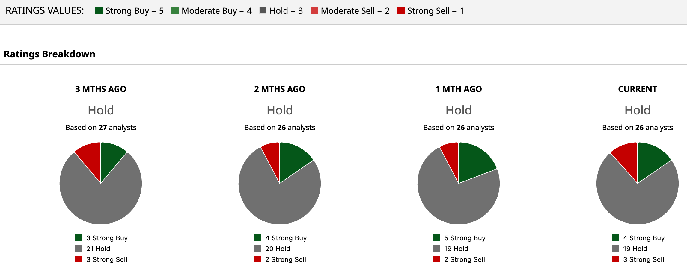Wall Street analysts are taking a cautious stance on Under Armour’s stock now, with a consensus “Hold” rating overall. Of the 26 analysts rating the stock, four analysts gave a “Strong Buy” rating, while a majority of 19 analysts are playing it safe with a “Hold” rating, and three analysts gave a “Strong Sell” rating. The consensus price target of $7.07 represents a marginal downside from current levels. However, the Street-high price target of $11 indicates a 58.5% upside from current levels.