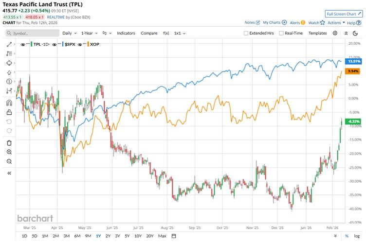 TPL has underperformed the broader market over the past year but outpaced significantly this year, with a slump of 7.5% over the past 52 weeks and substantial gains of 44.1% in 2026. Meanwhile, the S&P 500 Index ($SPX) has soared 14.4% over the past year and is up 1.4% on a YTD basis.