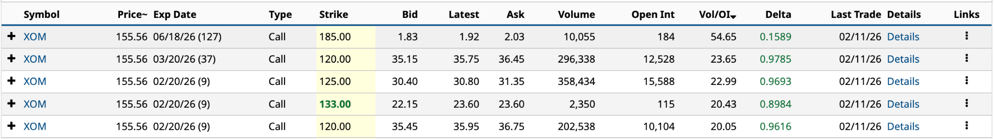 The most obvious and simplest, if you’re bullish, would be to buy a long call like the June 18 $185 strike or buy XOM shares and sell a call for income. However, I’m interested in multi-leg strategies, where possible.