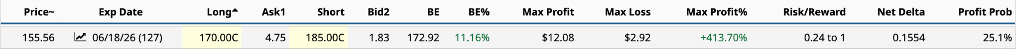 So, the first strategy is the Bull Call Spread, which involves buying a call option and selling a call option at a higher strike price. The short call reduces the cost of the vertical spread. Based on yesterday’s unusual options activity, buy a June 18 $170 call (Vol/OI ratio of 3.83) and sell the June 18 $185 call.