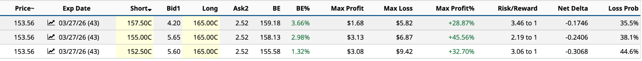 Instead, I’ve focused on the March 27 expiration, a 43-day DTE, for the bear call spread. The $152.50 short call is ITM by 86 cents, while the $155 is $1.44 OTM. I’d go with the $155. The maximum loss is much lower, while the maximum profit is five cents higher.