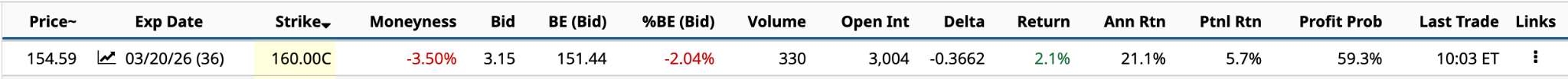 Assuming the share price at expiration is above $155 and below $160, I’d pocket $815 in income, an annualized return of 53.7% [$815 premium / $154.71 share price * 365 / 36].