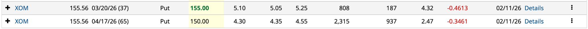 So, in this example, I’d buy 100 shares of XOM at $154.59 each. I’d sell one March 20 $160 call for $3.15 in premium, one March 20 $155 put for $5.00 in premium. While there’s a possibility of assignment for both the call and put, it’s unlikely.