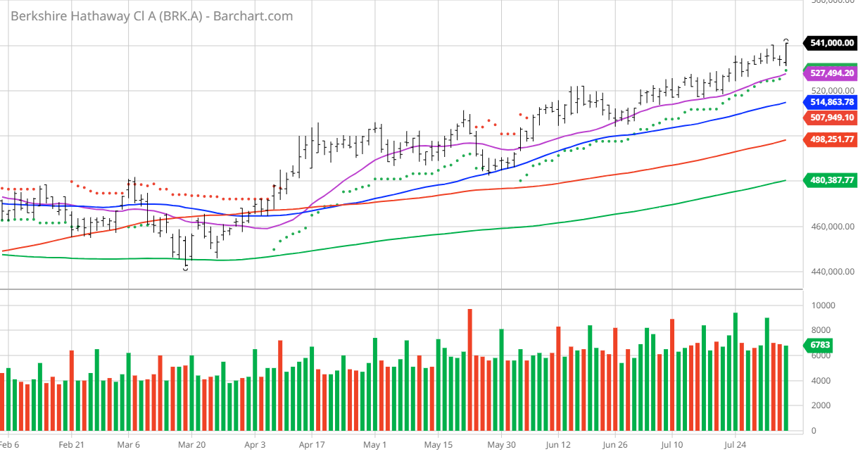 The Chart of the Day belongs to diversified financial holding company Berkshire Hathaway (BRK.A)  .  I found the stock by using Barchart's powerful screening functions to find stocks with the highest technical buy signals, highest Weighted Alpha, superior current momentum and having a Trend Seeker buy signal then used the Flipchart  feature to review the charts for consistent price appreciation. Since the Trend Seeker signaled a buy on 6/6 the stock gained 6.45%.