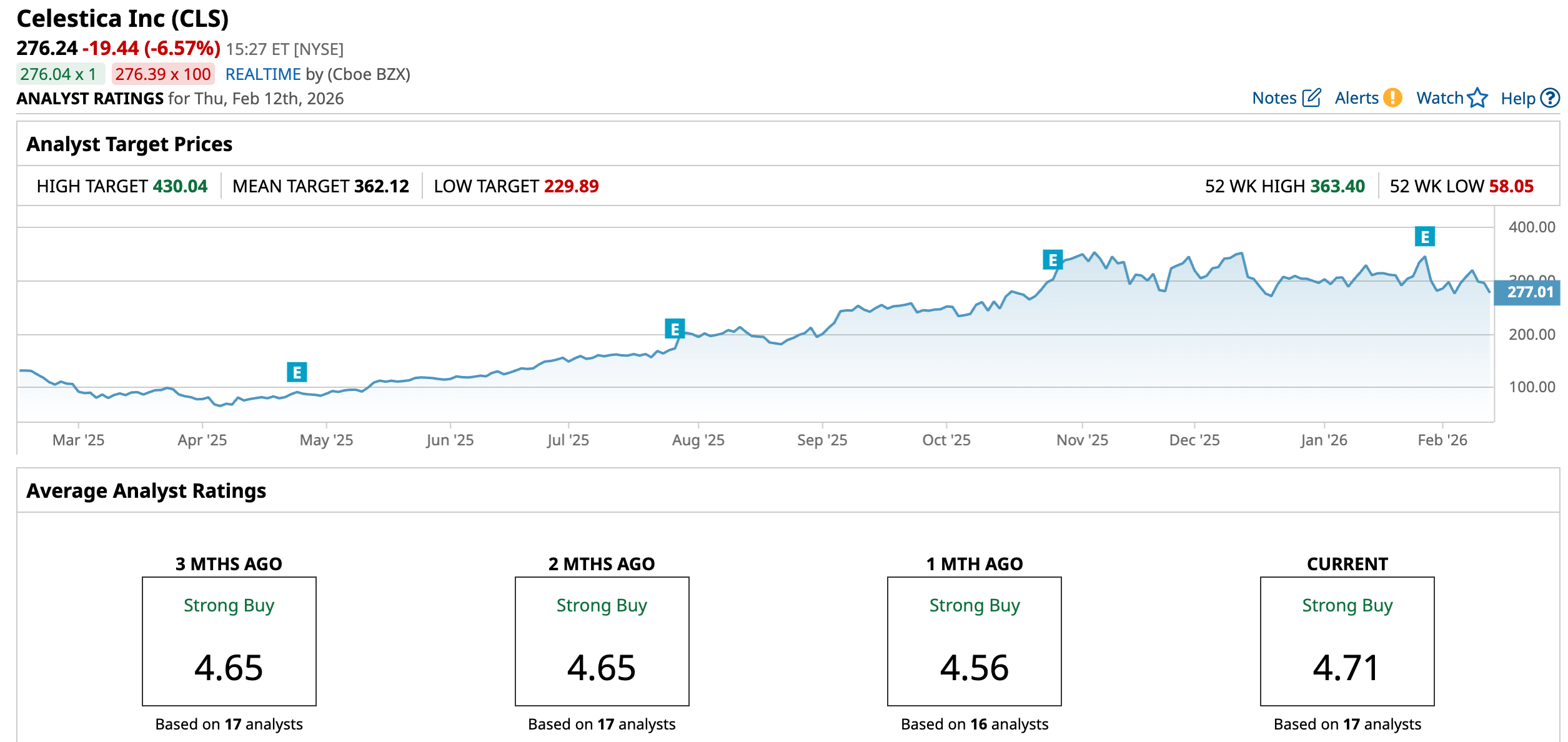 Wall Street is bullish on CLS stock. The consensus “Strong Buy” rating reflects Celestica’s ability to capitalize on long-term AI infrastructure spending.