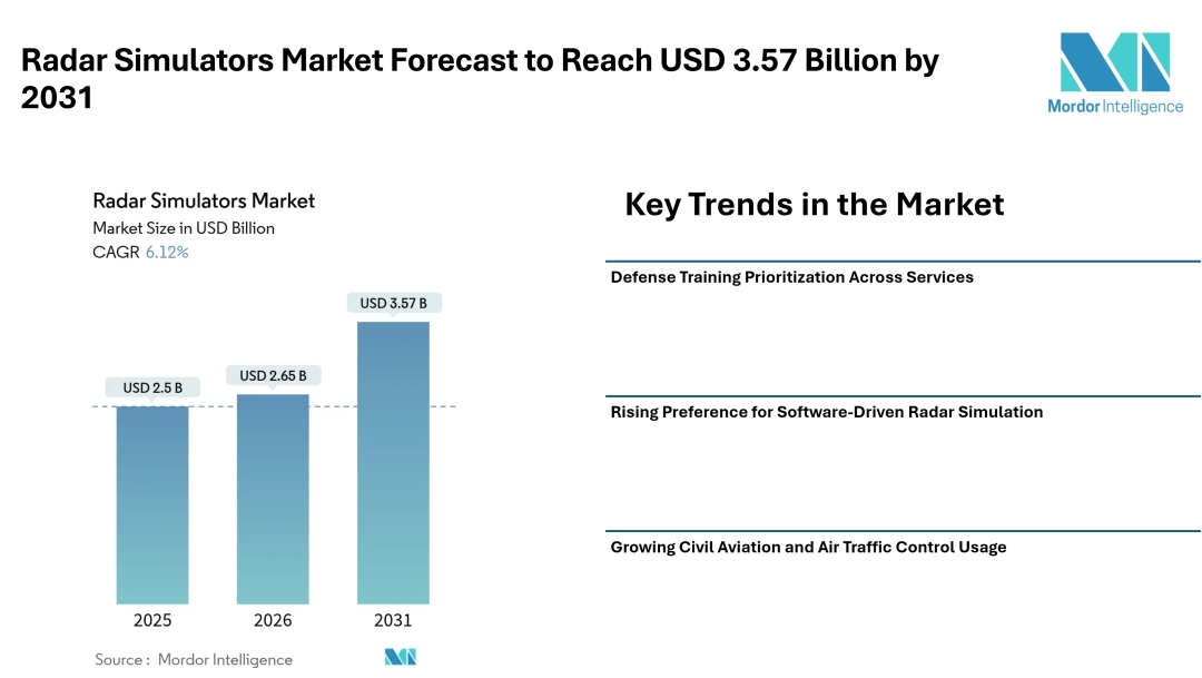 According to Mordor Intelligence, the radar simulators market size is estimated at USD 2.65 billion in 2026, and is projected to reach USD 3.57 billion by 2031. This expansion reflects consistent demand from military forces, aerospace manufacturers, and commercial aviation stakeholders seeking realistic radar training without dependence on live systems.