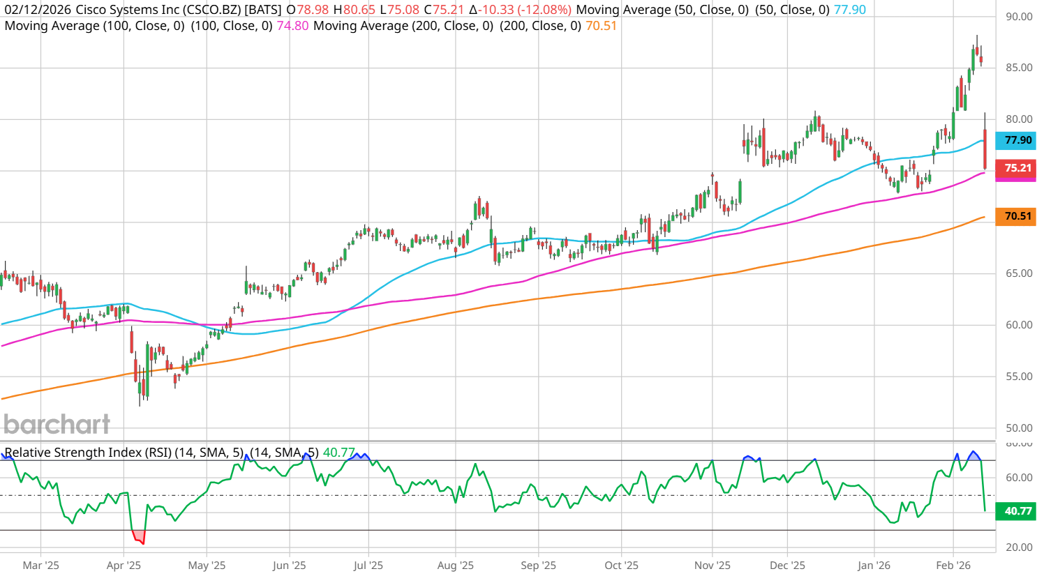 CSCO sliced right through its 50-day moving average, and now faces a test at its 100-day moving average, which has helped to contain lows in the stock since last October: