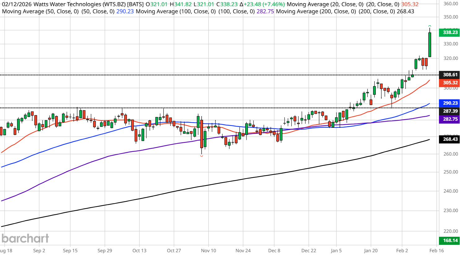Drilling down on this group, our old friend Watts Water (WTS) in particular is a standout in today’s market, up more than 7% after its own quarterly report. This “boring” trade on water is now trading sharply higher out of its recent trading range, and could be establishing a new, higher base on the charts.