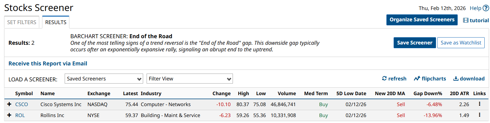 After last week’s “Godzilla-sized” End of the Road signal from tech giant Alphabet (GOOG) (GOOGL), we’ve got another tech monster hitting the screener today. None other than legacy tech name Cisco Systems (CSCO) hit the End of the Road with a thud earlier, as the company’s middling guidance and margin pressures have come under heavy scrutiny.