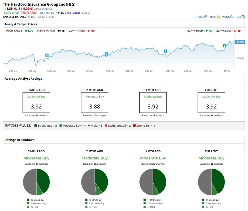 On Feb. 5, Keefe, Bruyette & Woods analyst Meyer Shields reiterated an “Outperform” rating on Hartford and modestly raised the price target to $163 from $160, reflecting continued confidence in the insurer’s outlook and upside potential.
