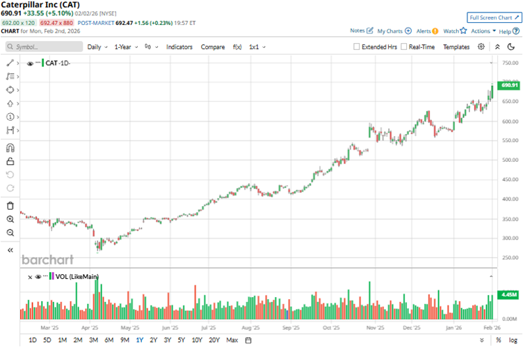The company’s shares have rallied 94.41% over the past 52 weeks and 63.96% over the past six months, as agriculture and manufacturing markets recovered to create a robust demand for its equipment, and the digital infrastructure demand for data center buildouts remains a strong tailwind. On the news of the rebound in manufacturing activity, Caterpillar’s shares reached a high of $710.03 on Feb. 3.