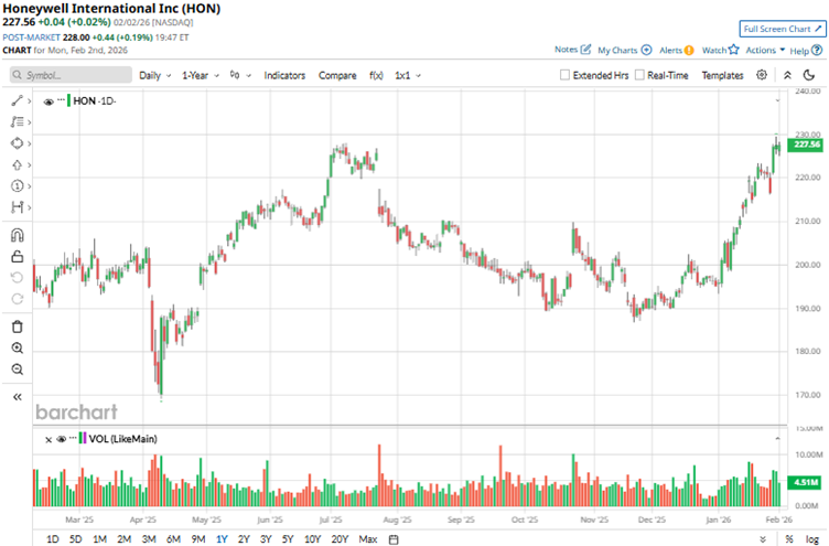 Honeywell’s stock also climbed by 4.9% intraday after it reported its Q4 and fiscal 2025 results on Jan. 29. The company’s revenue increased 6% YOY to $9.76 billion, or 11% organically, primarily due to strong demand in the aerospace and building automation segments. The company’s orders grew 23% organically, driven by double-digit growth in aerospace technologies and energy and sustainability solutions (ESS). Additionally, this increased the backlog 4% sequentially to more than $37 billion. However, the top line figure still missed Street analysts’ expectations.