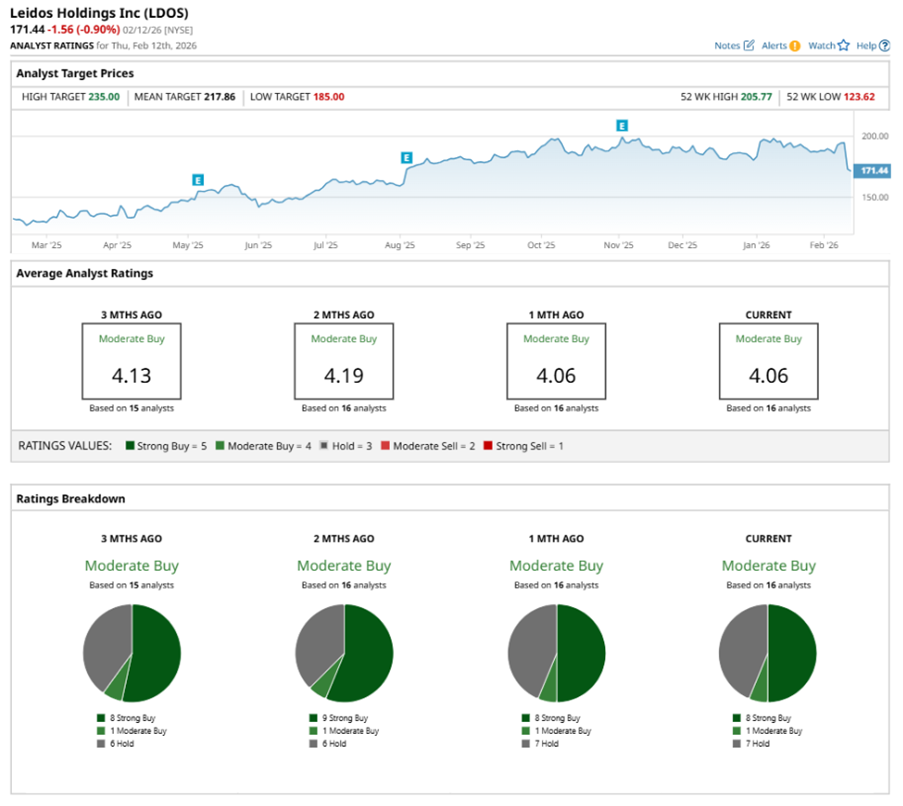 Among the 16 analysts covering LDOS stock, the consensus is a “Moderate Buy.” That’s based on eight “Strong Buy” ratings, one “Moderate Buy,” and seven “Holds.”