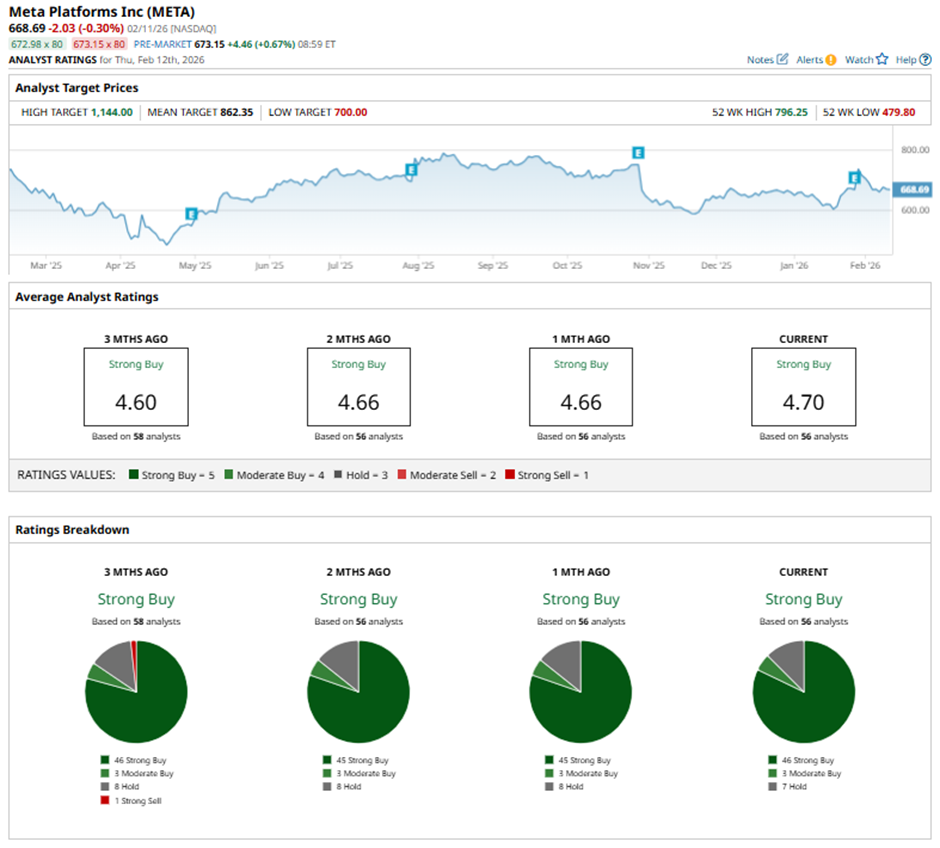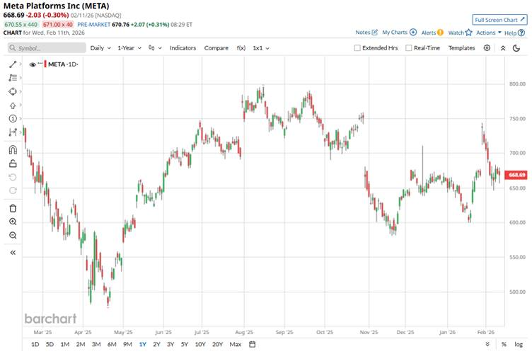 Over a longer 12-month horizon, the stock has declined 11%, lagging the S&P 500 Index’s ($SPX) 12% gains over the same period. That decline comes amid fears about the company's projected $115 billion to $135 billion in AI-related capital expenditures for 2026. META stock is currently trading 18% below its 52-week high of $796.25, which was reached back in August 2025.