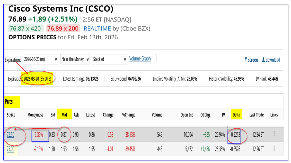 For example, look at the March 20, 2026, expiration period. It shows that the $72.50 strike price put, over 5% lower than today's price, has a midpoint premium of $0.87 per put contract.