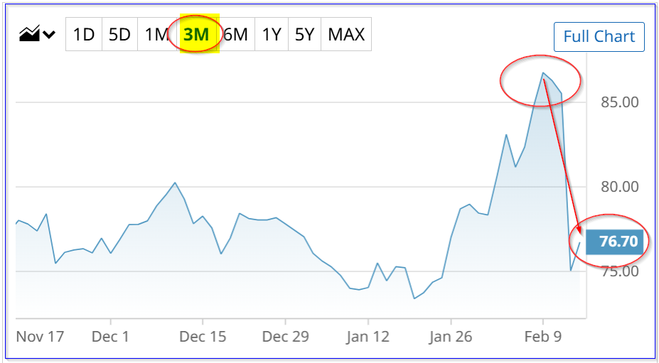 CSCO is trading at $76.87, down from a recent peak of $86.78 on Feb. 9, just before the Feb. 11 earnings release.