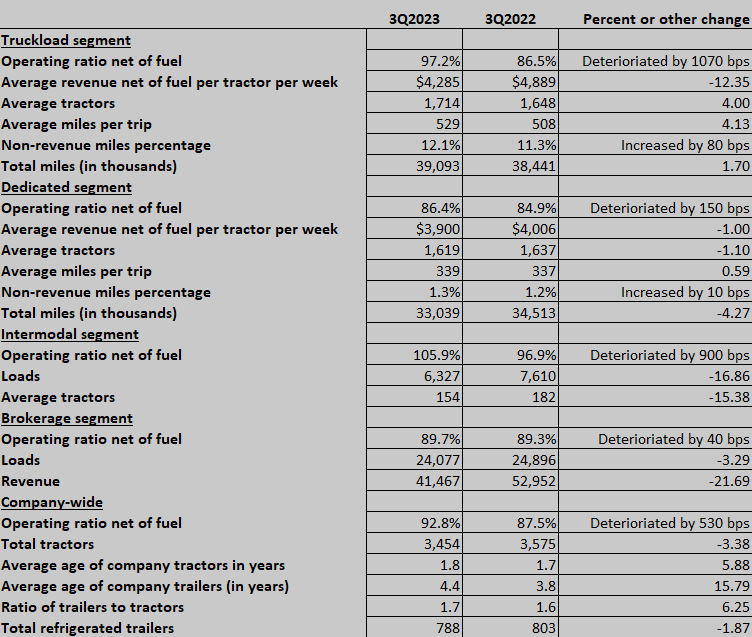 The company’s truckload segment, the largest by revenue, saw its operating ratio net of fuel slide to 97.2% from 86.5% in the corresponding quarter of 2022. Average revenue net of fuel per tractor per week dropped 13.4% to $4,285, though total miles rose to 39 million miles from 38.4 million miles.