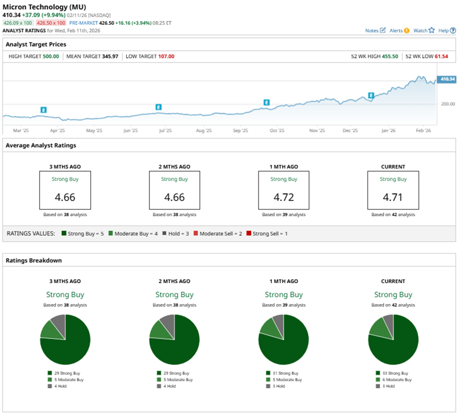 Despite intensifying competition, Wall Street’s conviction in Micron remains firmly intact. MU stock carries a consensus “Strong Buy” rating, with 33 out of 42 analysts calling it a “Strong Buy,” six assigning a “Moderate Buy” rating, and just three recommending a “Hold.”