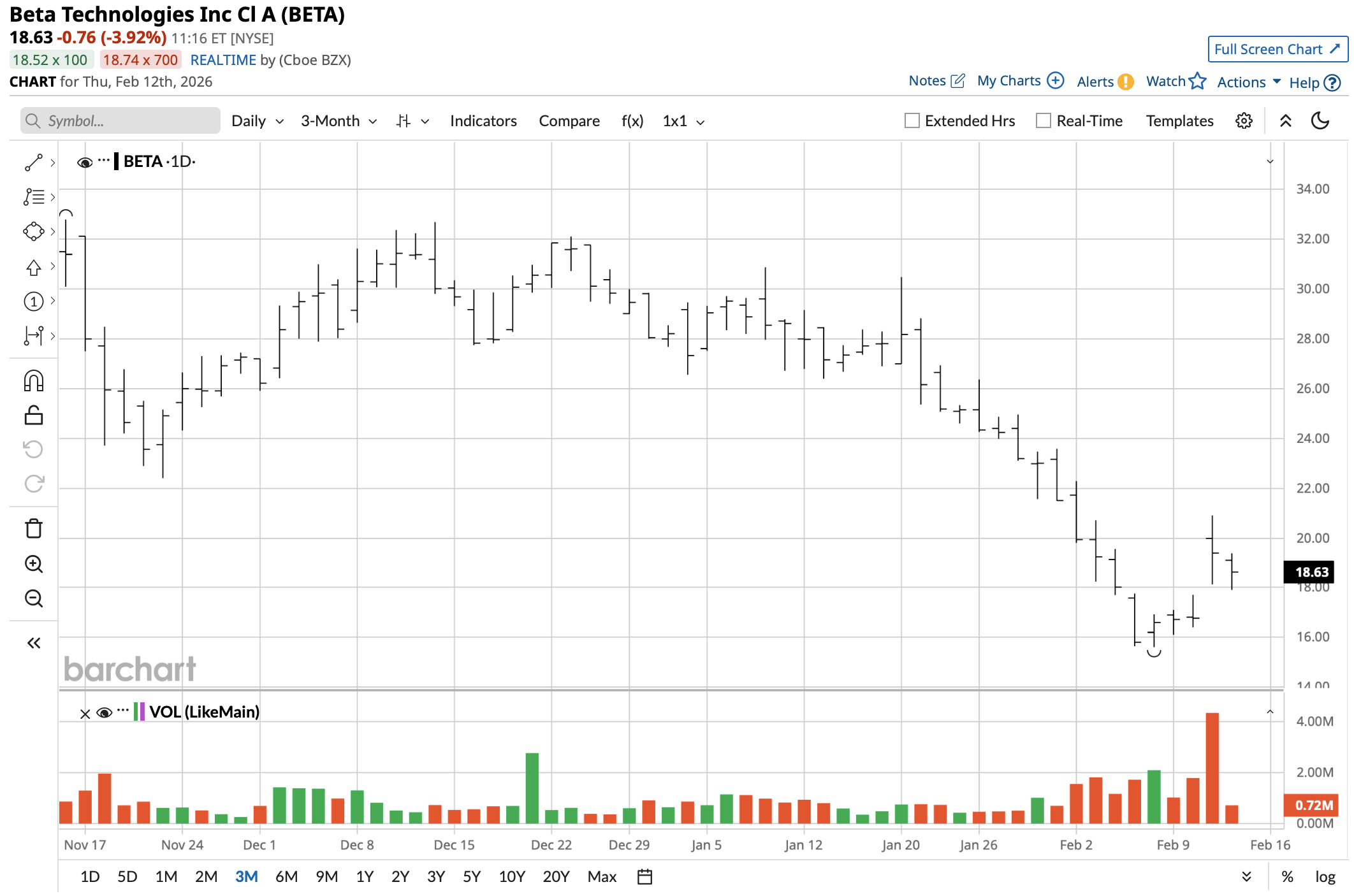 Shares of Beta Technologies (BETA) are again on investors’ radars after Jefferies gave the electric aircraft manufacturer’s stock a “Buy” rating, owing to a favorable risk-reward profile due to the recent decline. As BETA stock has been trading between $17 and $18, Jefferies' $30 target implies significant potential upside from the current levels.