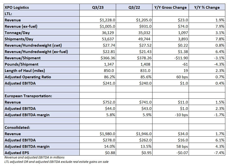 Compared to the second quarter, XPO’s shipments per day increased 5%, in part due to Yellow’s exit. Yield (excluding fuel surcharges) was also up 6% from the second quarter. The segment recorded an 86.2% adjusted operating ratio, which was 140 basis points better sequentially.