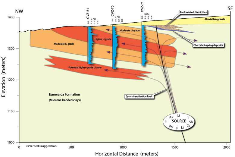 BRE identified and interpreted a concealed fault by tracing these fault-related (diamictites) and hot-spring-related (siliceous cherty rocks in the southwest and travertine beds to the northeast) rock units revealed on the surface. BRE believe that such a fault, and its clear hydrothermal remnants, played an essential role in the origin of the lithium-rich clays at Zeus. The ore deposit model that BRE has built for Zeus relies on the classic geology tenet of "Source-Pathway-Trap" and which is analogous to the model developed for Lithium America's Thacker Pass project.
