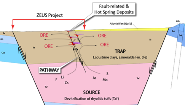The "Source" of the lithium at Zeus is at depth in a thick sequence of rhyolitic pyroclastic rocks (volcanic ash and tuffs). Devitrification of these hot volcanic materials releases incompatible elements, (such as lithium, fluorine, cesium) from volcanic glass (ash) to form a hot, buoyant lithium-enriched vapor/fluid phase. As well, the hydrothermal elements enriched at Zeus (S, As, Mo, etc.) also are sourced from depth.