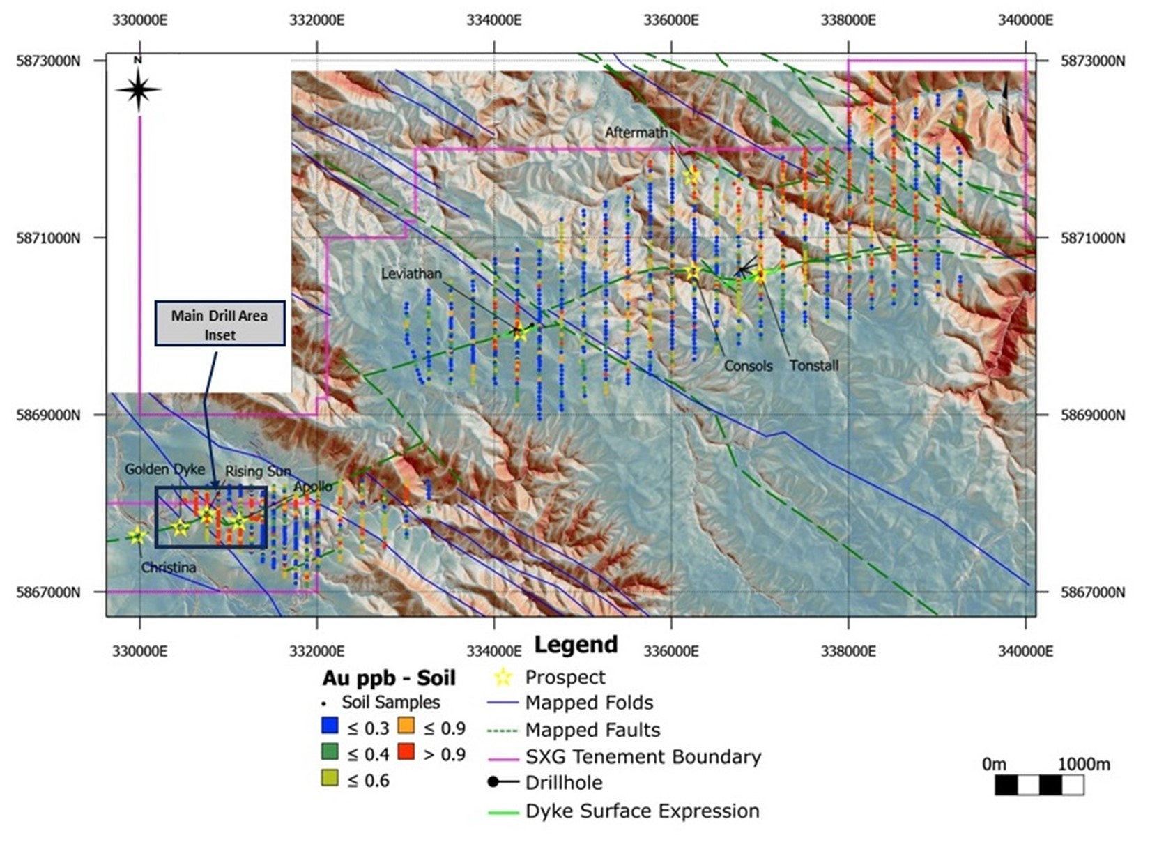 Sunday Creek is 100% owned by Southern Cross Gold ("SXG"), which is an ASX listed company owned 51% by Mawson. Four rigs continue to drill in the main drill area at Sunday Creek where 18 holes (SDDSC079, 83, 85-86, 88-99, 101, 103) are currently being geologically processed and chemically analyzed, and four holes (SDDSC0100, 102, 104, 105) are in drill progress (Figures 1-3).