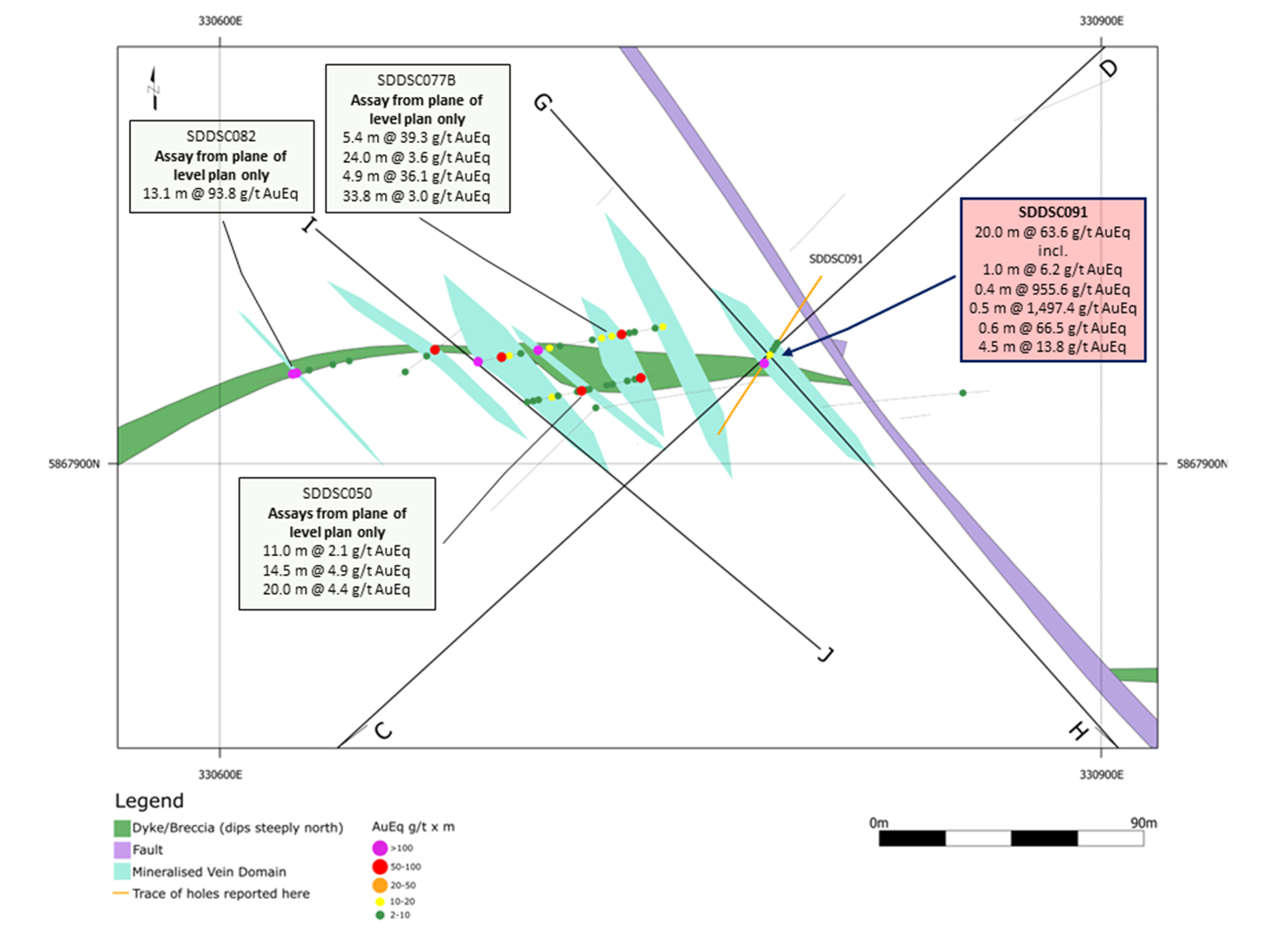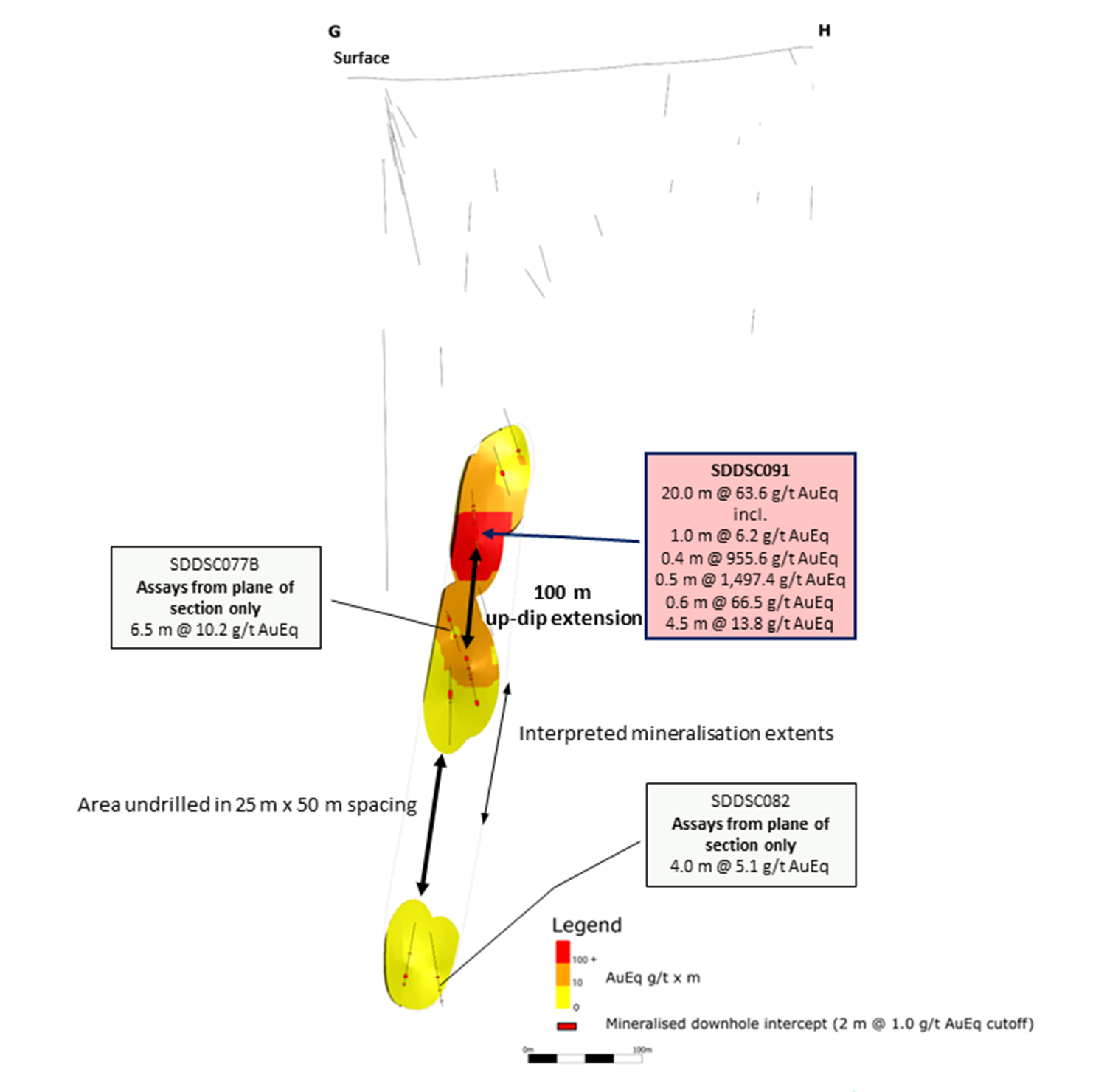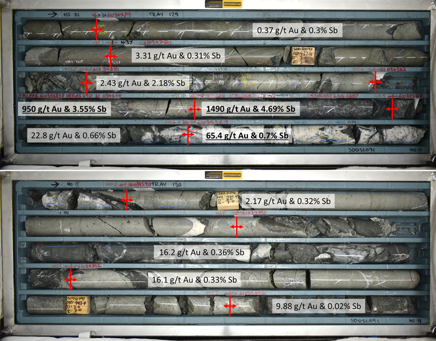 - SDDSC091: 20.0 m @ 63.6 g/t AuEq (62.7 g/t Au, 0.5% Sb) from 430.0 m