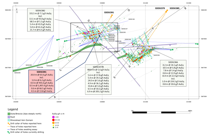 • SDDSC091 drilled the RS50 vein and is a 100 m up-dip extension from an intersection in drill hole SDDSC077B (6.5 m @ 10.2 g/t AuEq), previously announced on September 5, 2023 (Figures 1-5).