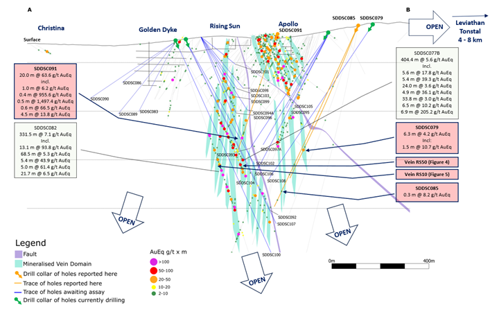 • Additionally, a further 2 holes (SDDSC079, SDDSC085) are reported from deeper drilling at Apollo. (Figure 3). These holes are important as they demonstrate the mineralized system extends 500 m below high-grade drilling at Apollo. Highlights include: