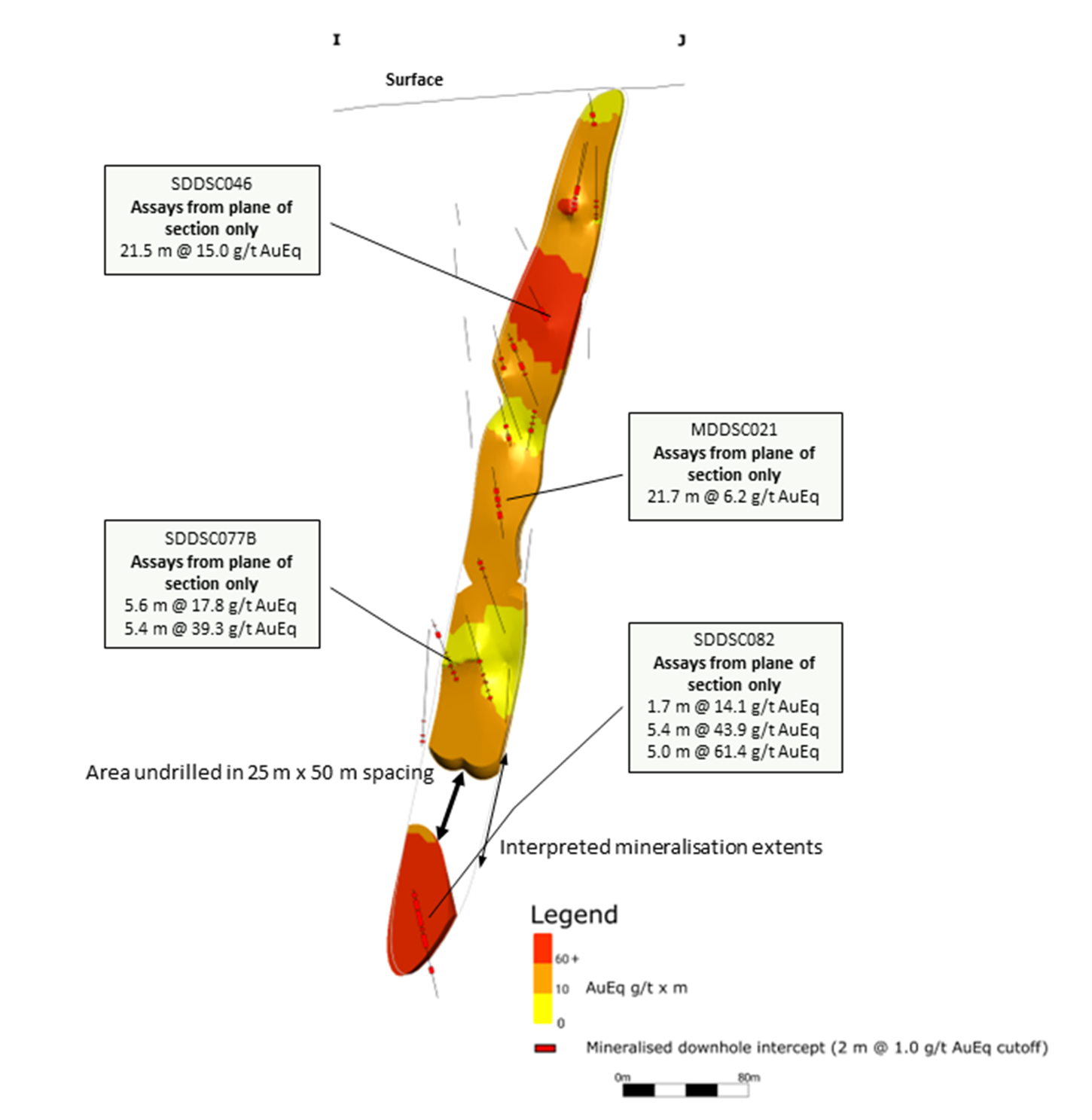 - SDDSC082: 1.6 m @ 500.5 g/t AuEq (500.3 g/t Au, 0.1% Sb) from 417.4 m