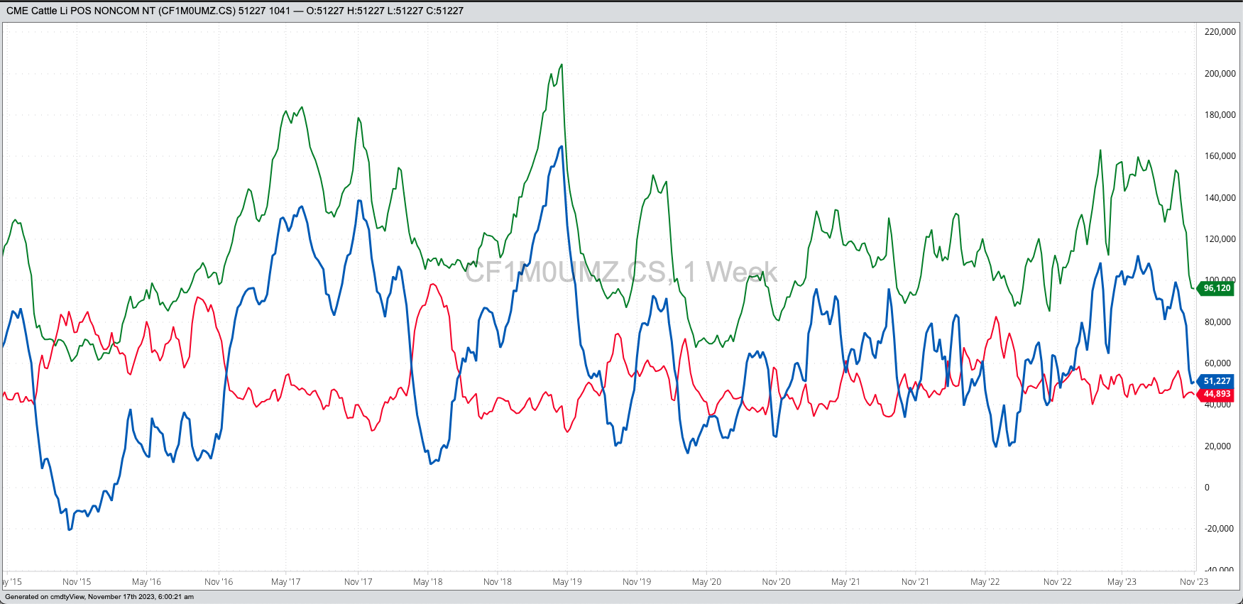 What happens next? When a market has funds going one way and fundamentals going another, it’s called a Rubber Band Disposition. Like a rubber band that is being stretched, the market will eventually snap and return to its base, with that base being fundamentals. In the case of live cattle, with fundamentals bullish and funds less so, the most likely way this plays out is for the noncommercial traders to start buying again. Is there an outside chance market fundamentals could turn bearish and follow funds? Yes, nothing is impossible. We’ve all learned that by now.Â
