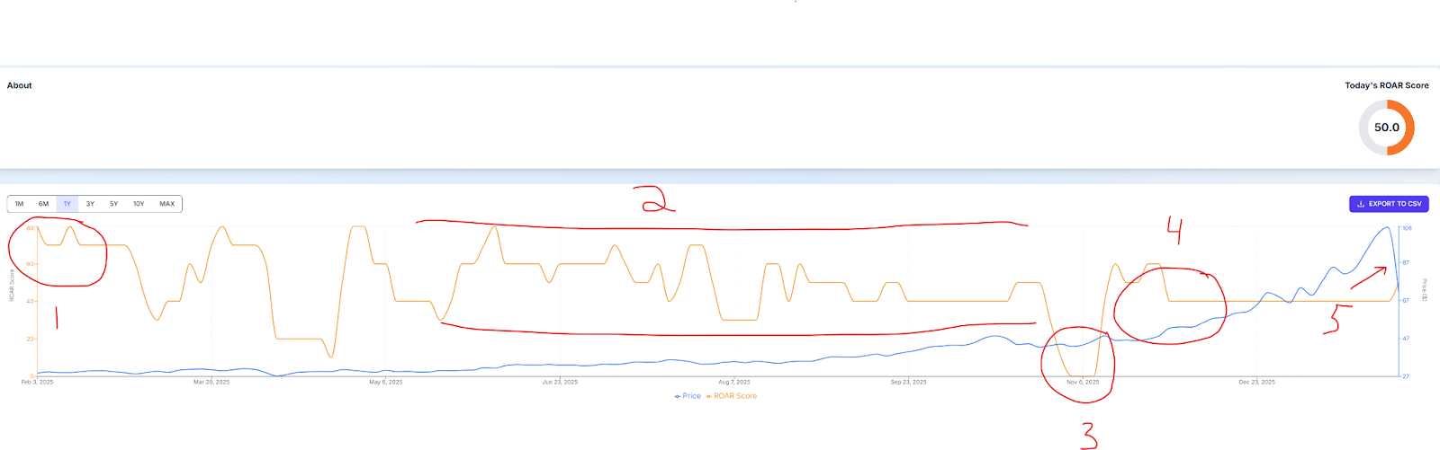 - As the price moved higher from May 2025 through October 2025, rising by about 50%, the ROAR score was happily trapped in a range, on either side of 50. That signifies that risk was neutral, neither elevated nor very low. A do-nothing signal.