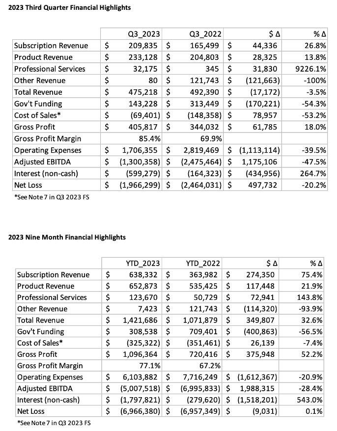 For the quarter ended September 30, 2023, total reported revenue of $475,218 was flat compared to $492,390 earned in the same quarter in 2022, but revenue from operations increased across the board. Product revenue increased by $28,325 or 13.8%, while Subscription revenue increased by $44,336 or 26.8%, and Professional services revenue increased by $32,175 vs $345 in the same period in 2022. Government grant funding was $143,228 in the 3rd quarter, a 54.3% decrease from the same period in 2022 due primarily to timing of payments on active grants. These positive results from operations show that Cloud DX revenues from new contracts are flowing and increasing.