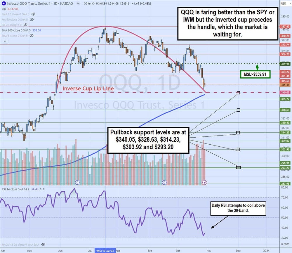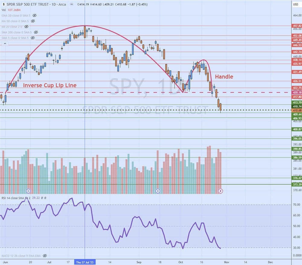 The daily candlestick chart on SPY illustrates an inverse cup and handle breakdown. The cup lip lines commenced on June 1, 2023, at $420.18. SPY rose to a peak of $457.82 on July 27, 2023, as it turned back down. The SPY fell to bounced off the inverse cup lip line on Oct. 3, 2023, to a high of $435.14. The handle formed as shares fell back down to retest and break the inverse cup lip line, which also overlaps with the daily 200-period moving average at $420.18. The daily market structure low (MSL) trigger support is $410.74. The daily relative strength index (RSI) has again slipped to the oversold 30-band. The key pullback support areas are $400.87, $390.85, $386.59 and $379.39, which is the cup and handle downside extended target.