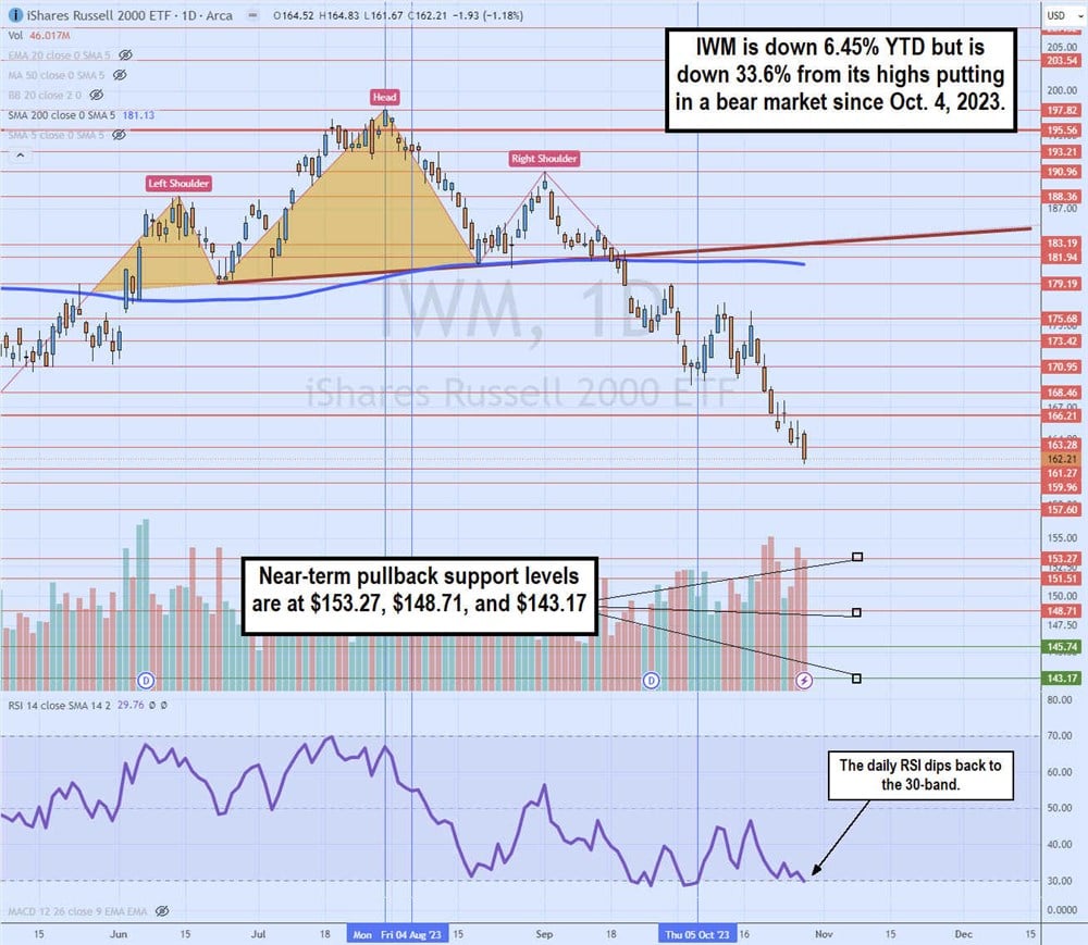 The daily candlestick chart on IWM illustrates the extensive collapse from the head and shoulders breakdown collapsing through the 200-period MA near $182. IWM has been in bear market territory since peaking and falling under $195.96 on Aug. 4, 2023, at the 20% pullback level from its highs. IWM is now down 33.6%, firmly in bear market territory, having fallen under the $166.21 November 2020 gap-fill support level. The daily RSI has slipped back down to test the 30-band again. Near-term pullback support levels are $153.27, $148.71 and $143.17.
