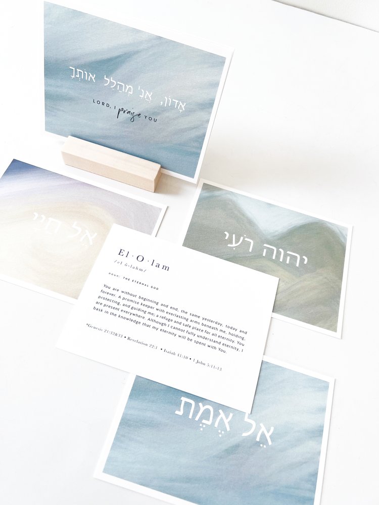 - 10 prayers on 10 cards, with the front side displaying a Hebrew name for God and the back side offering an English translation and a prayer of praise.