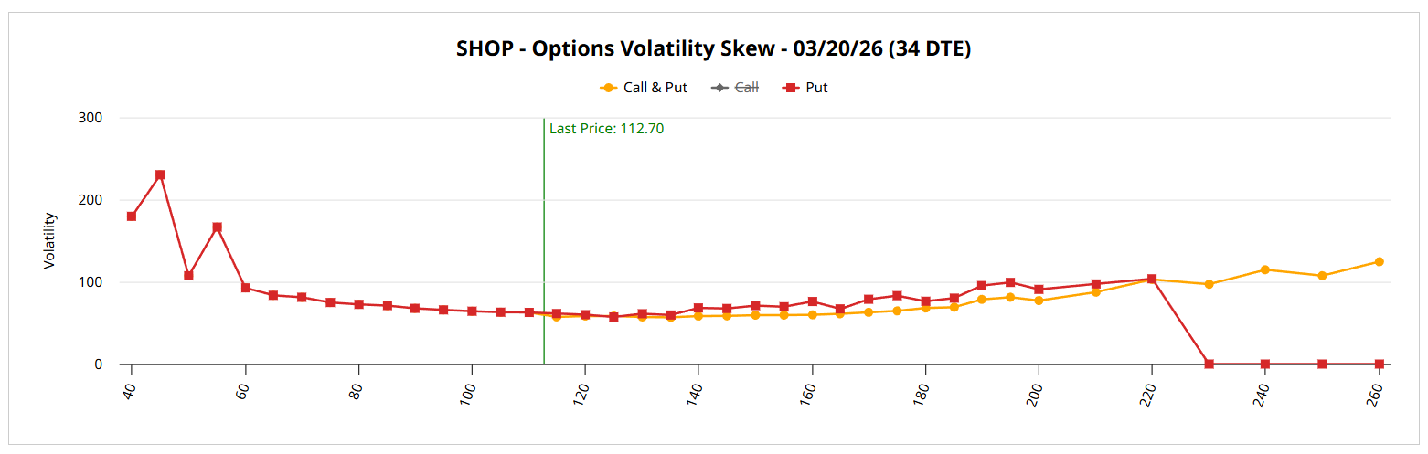 I say that because the volatility skew for SHOP stock for the March 20 expiration date is relatively relaxed. Again, it’s not that there isn’t any downside hedging because insurance against that event has been priced in. However, the protection is occurring at the left wing via out-the-money (OTM) puts. On the right wing, the IV curvature for both puts and calls is relatively flat, with calls extending further than puts.