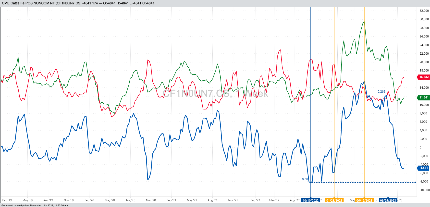 Jan24 feeders (GFF24) fell from its mid-September peak to a low of $209.15 the week of December 4. In other words, while it took roughly 8 months to gain $58, it took less than 3 months to erase it all, with an extra $1.35 thrown in for good measure. To start putting together the pieces as to what happened, let’s start with Newton’s First Law of Motion applied to markets: A trending market will stay in that trend until acted upon by an outside force, with that outside force usually noncommercial (fund) activity. This is also why Newsom’s Market Rule #1 says: Don’t get crossways with the trend. If you do, you are getting crossways with large noncommercial money, a situation that usually doesn’t end well.