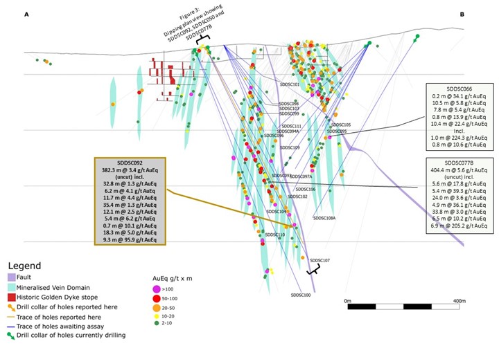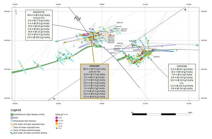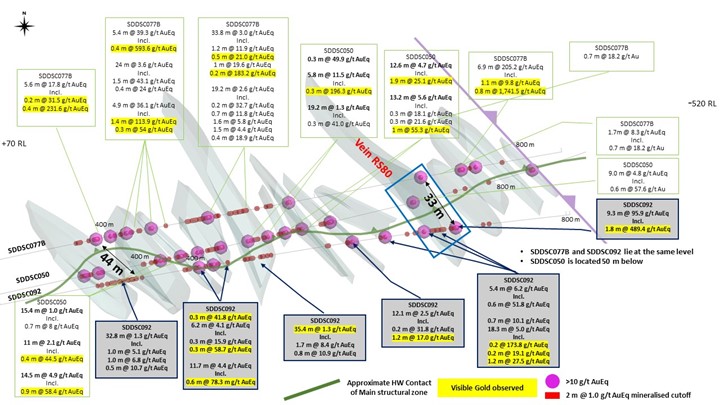 SDDSC092 drilled a 33 m to 44 m strike extension of multiple mineralized veins at the same horizontal level as previously reported drillhole SDDSC077B ((404.4 m @ 5.6 g/t AuEq (uncut)), which traversed 13 individual high grade vein sets (Figures 3). Selected highlights include: